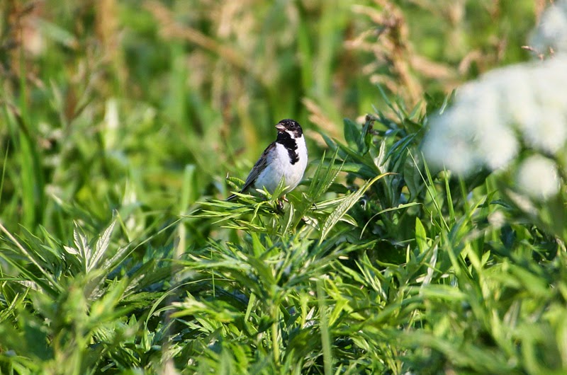 エゾニュウだかオオハナウドだかの枝に留まる夏羽のオオジュリン雄。