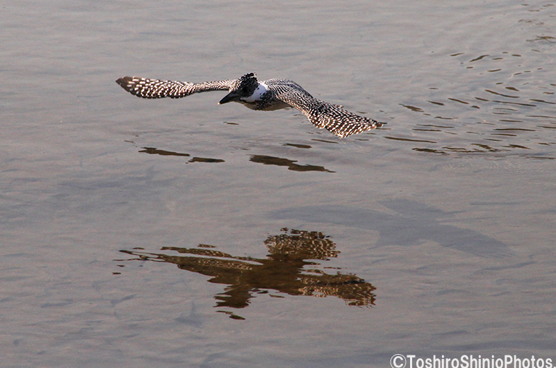 これも馴染みのヤマセミ。川舟に戻って来る際、水面を鏡として映る己の像と太陽によって出来る影(シャドウ)二つの影を写しながら飛ぶヤマセミ。勿論撮影時に等判りもしない偶然。