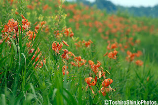 ツクシイバラ原生地の土手に咲き乱れているオニユリ。