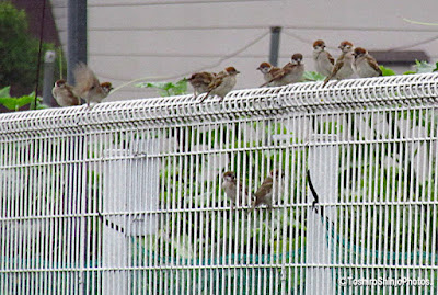 猛暑日が4日続いた翌日の今朝は少し涼しい。雨は合間らしいが、昼すぎからまた降る様だ。今朝の愛犬散歩でもスズメの小群に遭遇、いつもの場所だ。近所の人が残飯を近郊農家ののフェンス沿いに撒くので集まるらしい。