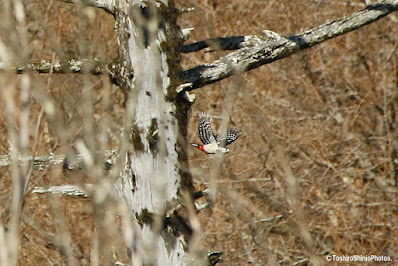 そのアカゲラに今回は幾度も出遭い、普段橡林や樺林などの林間に生息しているはずのアカゲラがオープンエアで幾度も姿を見せていたので、是非飛翔シーンを撮ろうと身構えた。